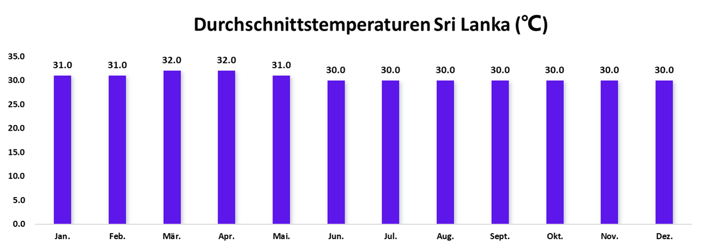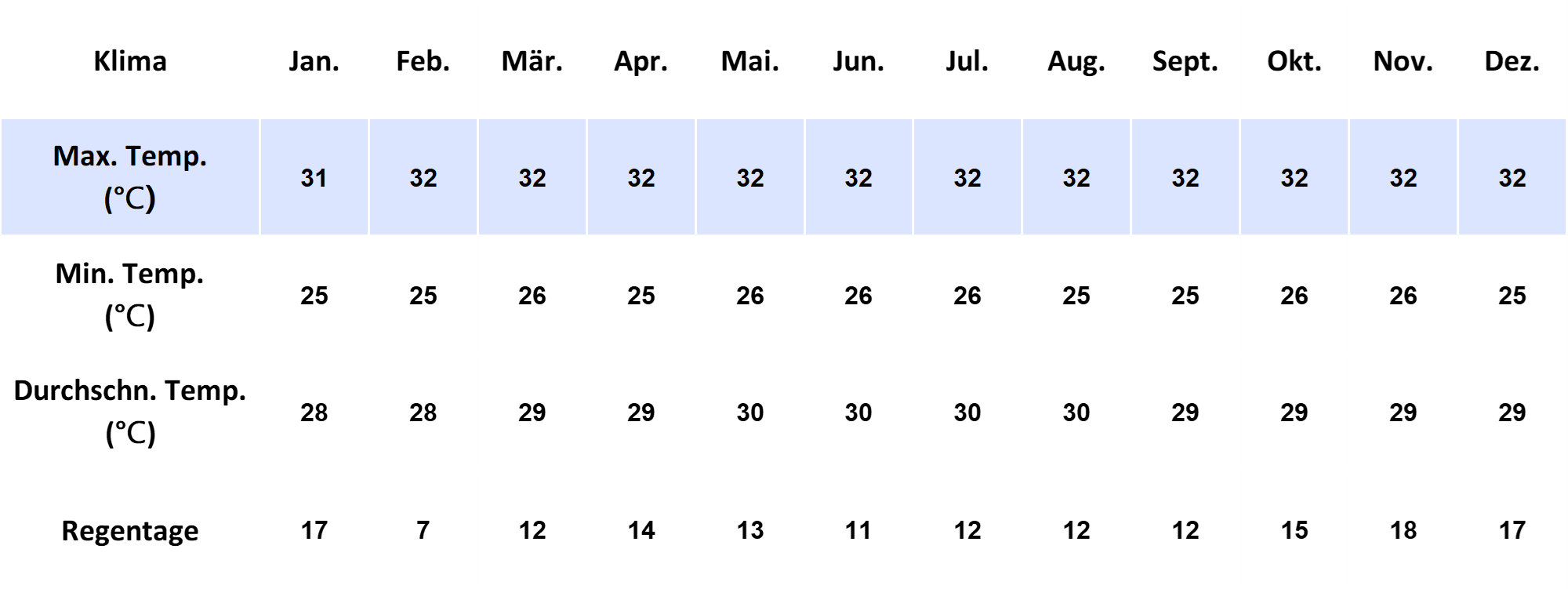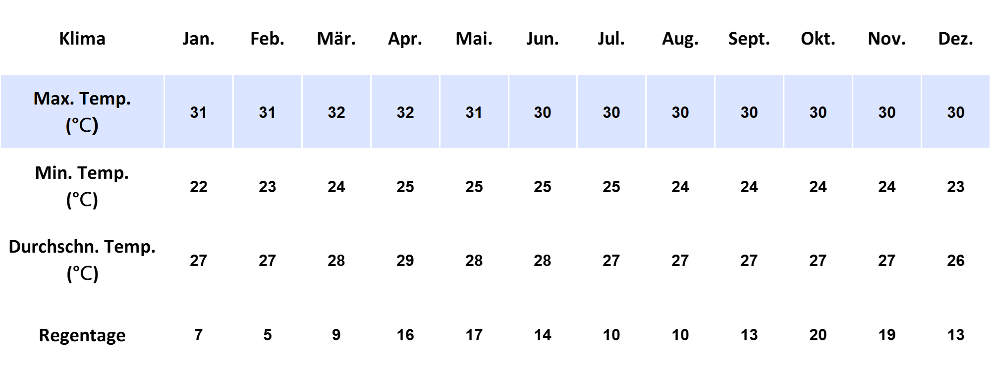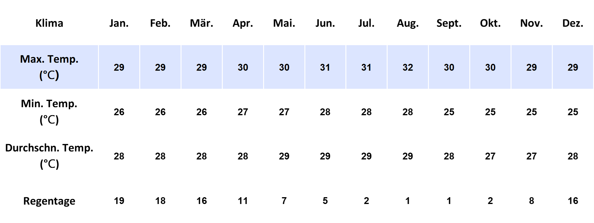 Trockenzeit (Mai bis Oktober) | zwischen 27 °C und 32 °C | Meist sonnig, kaum Regen | Gehoben |