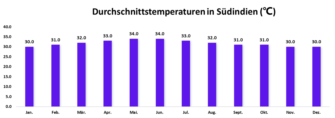 Vormonsun (April bis Mai) | zwischen 27 °C und 32 °C | Glühend heiß, hohe Luftfeuchtigkeit | Mittel |