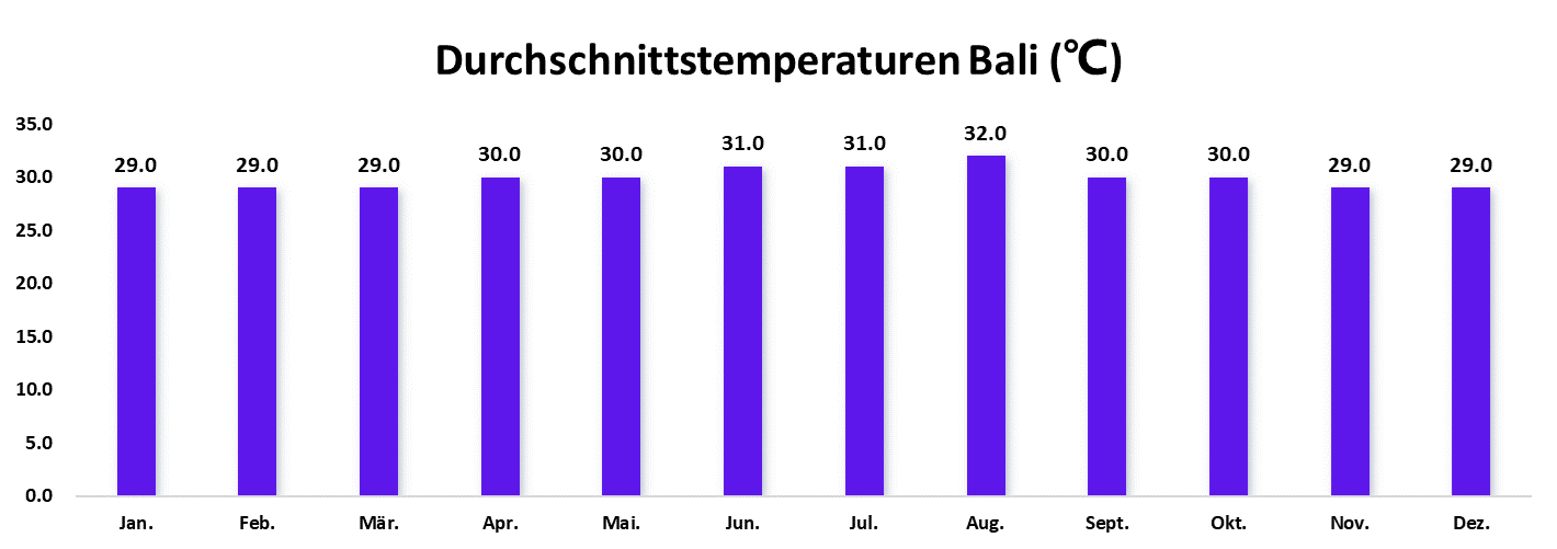 Bali verzaubert mit seinen leuchtenden Stränden, terrassierten Reisfeldern und seiner einzigartigen tropischen Atmosphäre. Zwischen Mai und Oktober ist das Wetter dort warm, trocken und überwiegend sonnig, mit Temperaturen zwischen 28 und 32 °C. Das ist die ideale Reisezeit, um die atemberaubende Landschaft, das Meer und Outdoor-Aktivitäten in vollen Zügen zu genießen.