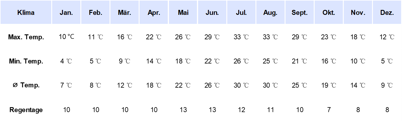 | Region | Warme Jahreszeit | Kalte Jahreszeit | Klima |