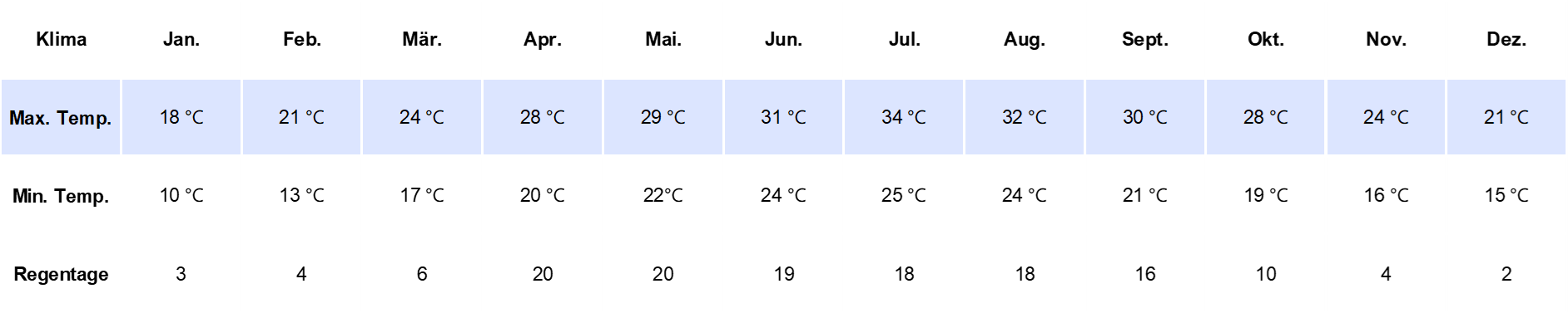 Frühling (März bis Mai) | 22 bis 26 °C | 18 bis 23 °C | 12 bis 18 °C | 10 bis 20 °C |