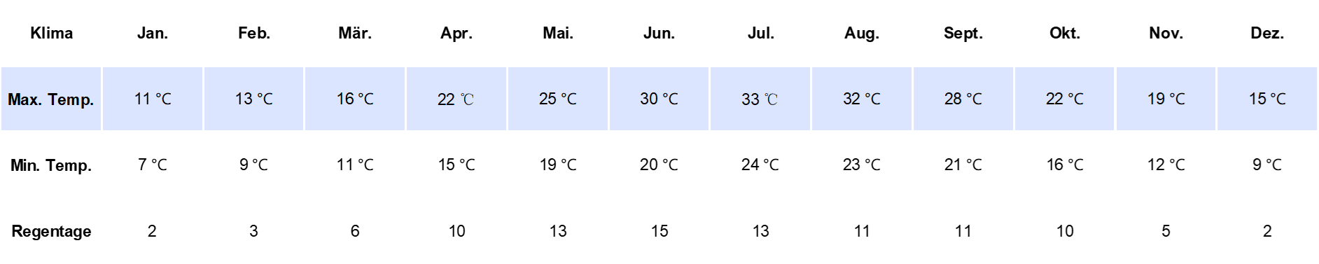 🗓️ Empfohlene Reisezeit: März bis Mai / September bis November, 14-23 °C
