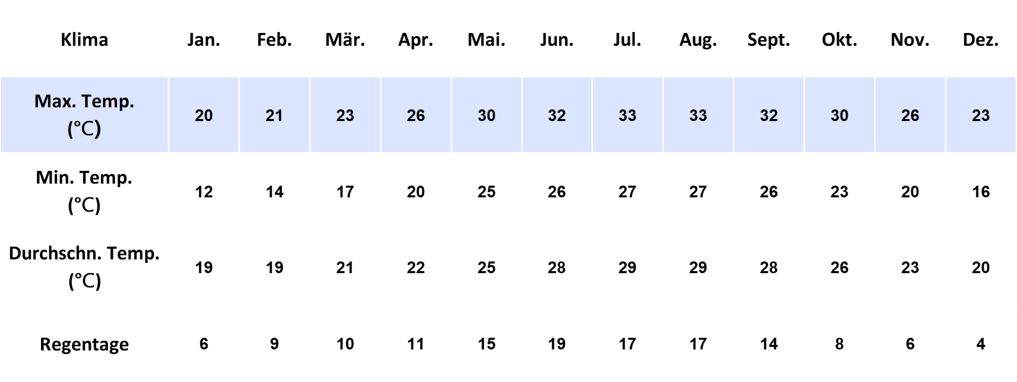 Günstig | Juni – September | Tropische Hitze, Regen | 650 € – 850 € | 80 € – 90 € |