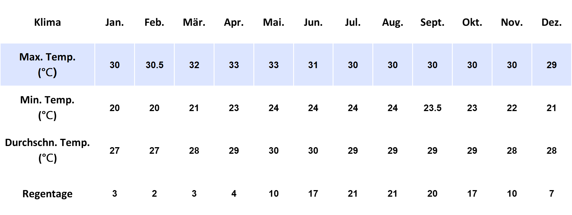 Westküste | Nov. bis Mai (Kühle Zeit: Dez. bis Feb.) | Juni bis Okt. | Typisches Monsunklima. Intensive Regenzeit mit höchster Taifungefahr. |