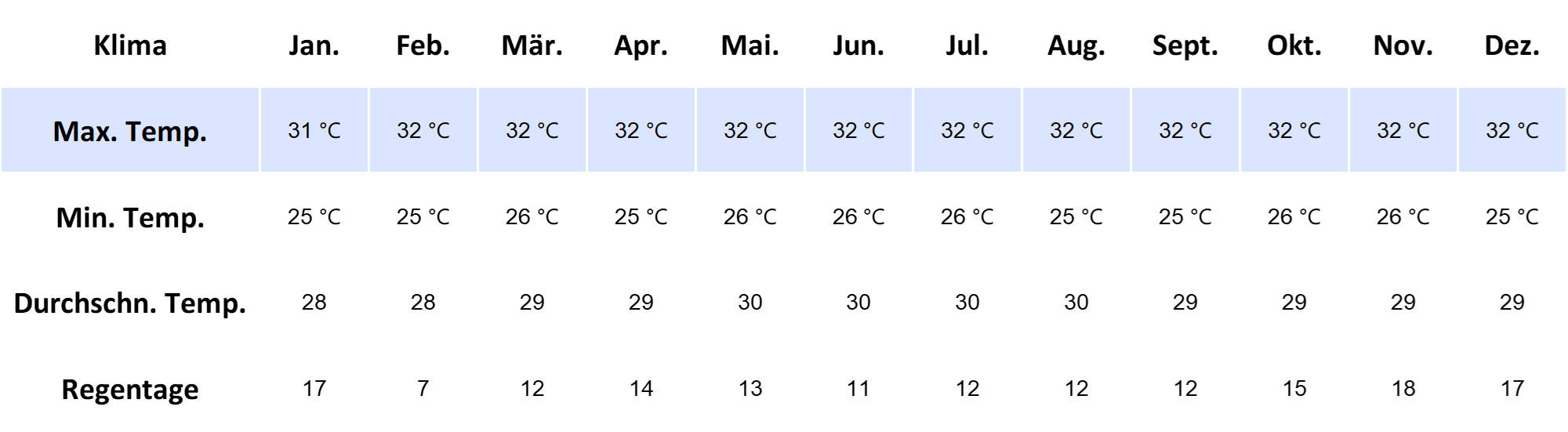 Regenzeit | November bis März | 25°C - 31°C | Sehr hoch | Häufige, starke Regenfälle, oft bewölkt, besonders feucht von Dezember bis Januar |