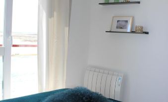 Small entrance (geometric wallpaper), bathroom with shower and toilet, living room with sofa bed, coffee tables, Scandinavian row, TV, dining table for 4, fully equipped kitchen, bedroom with double bed 140X200. South-west exposure, very bright apartment, the two picture windows give on the sea.