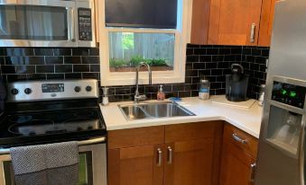 Our guest house is located behind the main house nestled in our beautiful backyard. Enjoy two bedrooms with a full size bed and single bed (+trundle bed) and one bathroom with shower. There is a full kitchen with a coffee machine and kitchen supplies for cooking.