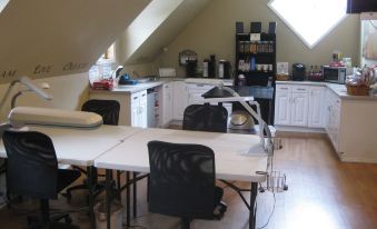 The home is well appointed with a fully stocked kitchen including utensils, paper products, cookware, cooking ingredients, coffee, and snacks. Each of the 3 bedrooms have plenty of beds for everyone in your group along with cozy linens. The 2 bathrooms inside the home are furnished with complimentary shampoo, conditioner, body wash, feminine products, facial cleansers, body lotion and more. There are a variety of common spaces that can be used for watching TV/movies, dining, relaxing and creating. Please note that the home itself has 2 bathrooms with showers. The crafting workshop/meeting room above the garage hosts the third bathroom. Access to this additional space is optional with your reservation at the rate of $75/night.