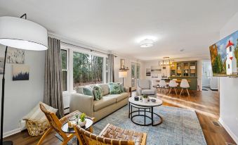 We were all super impressed with the interior design and it made our cozy stay fantastic! The kitchen was fully equipped for any of our appliance needs, the dining table had room to seat us all, and the home was the perfect size for our 7 person girls trip! We also enjoyed campfires, sitting on the front porch, and passing a volleyball in the yard! It was so nice to be in a more secluded area! Would recommend!!