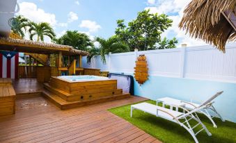 Whether you practice the sport of surfing, golf, riding horses, snorkeling, sunbathing on the beach of Isabela, know that you do not need to leave Casa Babbie to fully enjoy. Available for your use there is a spacious deck area with a gazebo bar, barbecue for the grill lovers, bohio for outdoor dining and a jacuzzi that will pamper our guest. Also a covered terrace with chairs for those who like to be in the shade and two hammocks to take a nap anytime needed. Includes another table and chairs to eat outside roofed. The house is composed of 3 bedrooms for 6 adults, 3 queen beds, 2 bathrooms, full kitchen, cable/internet.