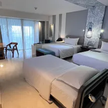Das Hotel liegt am Jimbaran Beach. Der Grill am hinteren Strand ist voller Rauch und es ist etwas stickig. Das Frühstück ist im westlichen Stil gehalten, was ich nicht gewohnt bin. Der Pool ist groß, aber die Wassertiefe beträgt nur 1,2 Meter. Das Zimmer ist recht groß und es gibt Dutzende Spas in der Nähe. Für nur einen Block gibt es von mir 3 Punkte.