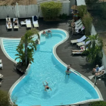 Great hotel. A bit out of town meaning a taxi trip of anything between 8€ on the meter or 15€ when the driver “forgets” to set it. Great rooms. No bar, but a self-service facility available. Nice pool area and a tremendous breakfast.