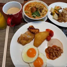 Das Frühstück war erstklassig, mit Nudeln, Fleisch und einer Mischung aus westlichen, chinesischen und malaysischen Gerichten. Wir konnten sogar Affen auf den Bäumen in der Ferne beobachten. Wenn man die Vorhänge aufzieht, blickt man direkt aufs Meer. Das Geräusch der Wellen, die Jet-Skis und Parasailing-Boote – einfach herrlich! In der Nähe gibt es Restaurants und einen Supermarkt, was sehr praktisch ist. Wir kommen gerne wieder!