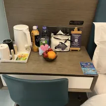 Die Umgebung ist gut. Im Zimmer sind Getränke und Obst vorhanden. Es gibt einen Luftbefeuchter und Ohrstöpsel.