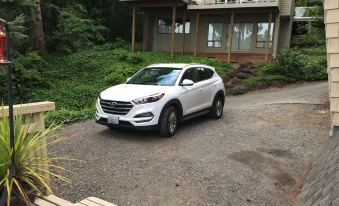 One is upstairs, one is on the main entry level. The 3rd queen bedroom is upstairs and also has a trundle bed that opens to offer 2 additional twin mattresses best suited for teens. On the main entry level floor, we also have 1 full sofa-bed with a 4" memory foam mattress and our extra wide reading chair pulls out to create twin bed. Portacrib and high chair upon request. Please note that stairs are open backed and oriented in a way that makes them difficult to block off to kids. There is a step up to the kitchen and a step down to the family room. The deck overhangs our hillside and the yard is not fenced. Most kids are fine but you have to watch them closely. The parking area is packed gravel and there is room for 2 cars. There is room for 1 car at the waterfront if you pull up close to the hedge.
