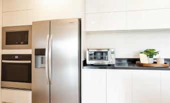 • Fully equipped kitchen with stainless steel appliances, cookware, and dining essentials