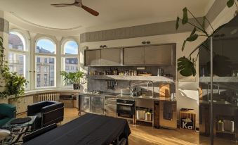 Inside, you'll find a well-appointed living space. As I occasionally reside here myself, guests are welcome to enjoy a variety of spices and ingredients, freely available for their use! The apartment's high ceilings and ornate stucco elements create a sense of spaciousness, while the tasteful blend of vintage and contemporary furnishings adds a unique and charming character.