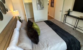 Spacious Master Bedroom: Features a king-size bed, large closet, and Smart HD TV, with an attached full bathroom (shower/tub combo).
