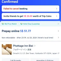Did not manage to stay in the premise due to last minute flight cancellation by Jetstar and reached the New Chitose airport only at 8pm! No train service available to Biei by the time and had no choice but to stay in Sapporo instead. Had submitted for cancellation but was denied even though I have even submitted the flight cancellation letter from the airline.