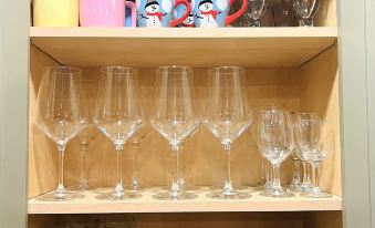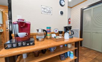 A Full Kitchen with stove/oven, refrigerator, dishwasher, microwave, blender, toaster, slow cooker, dishes, pots/pans, spices, wine glasses, 8 person Large dining table for family meals, AND a guest favorite - Coffee and Hot Cocoa Bar, with coffee maker, Tea Kettle & a Keurig machine complete with all the supplies