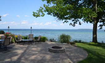 The patios offer plenty of seating, a gas grill, and a fire pit. The home faces east, making it perfect for enjoying gorgeous sunrise views. It is placed directly on the waterfront and is only minutes from downtown Traverse City.