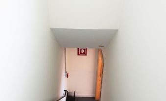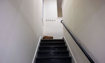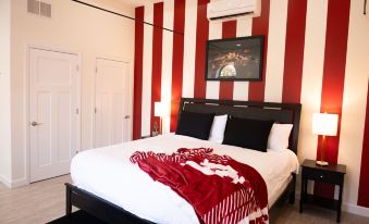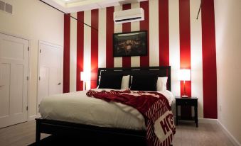 The suite has a staircase inside upon entry leading you to the great Cream & Crimson wall! The studio boasts a king size bed, all modern Samsung appliances, and 55 inch Samsung Smart TV.