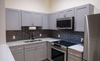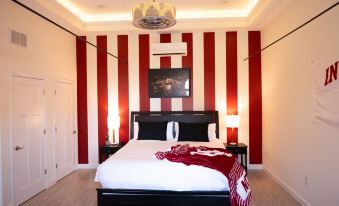 Welcome to Bloom! The Hoosier Suite invites you to stay away in downtown Bloomington, IN. Our suite has all modern appliances and finishes, tray ceiling lighting, and cream & crimson stripes to dazzle your eyes.