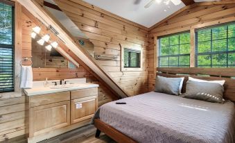 Upper level has one bedroom (queen bed) and a half bathroom. From the loft you can sit and enjoy beautiful views of the mountains.