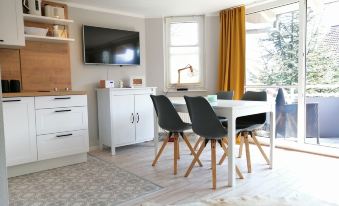 The comfortable sofa bed and the small reading corner offer space to relax. The sofa in the living / dining room can be pulled out (lying area 200 x 150 cm), so that 2 people can sleep there in addition to the bedroom.
