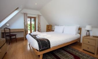 The house offers a vast, open plan kitchen/dining/living area with something for everyone: a well-equipped kitchen, space for formal and informal dining and an additional daybed that converts into a full-size double. Entertainment is provided by a 55 inch TV with Amazon Firestick and a Foosball table, as well as traditional board games. The downstairs area is completed by a large, spa-style wet-room with an elegant, walk-in rain shower. A spectacular spiral staircase takes you to the first floor bedrooms, each designed to be a tranquil retreat. The master bedroom leads to an en-suite bathroom with double wash-basins, contemporary fixtures and a free-standing bath.