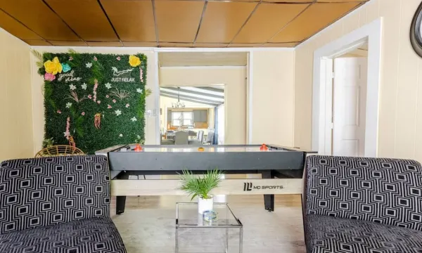 This spacious home features a modern living room area, which includes an electric fireplace with a 55 inch smart tv. The Game Room is perfect for hosting because it contains a selfie wall, pool table, board games, and everyone loves Pac Man. The dinning room is great for your family dinners as it seats up to 10 people. The kitchen comes fully stocked with everything you need to cook and entertain, with additional seating at a high top table that sits up to 4 people.