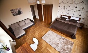 Очень красивые апартаменты с роскошной обстановкой, милыми деталями интерьера, удобная большая кровать с большим количеством подушек, все чисто и уютно. Нас очень радушно встретила хозяйка, помогла нам оформить обратный трансфер в аэропорт и заранее принесла нам завтрак с собой в дорогу) Отель находится в историческом здании на втором этаже, в красивой парадной с мраморными лестницами и старыми атмосферными двориками. У нас был номер с потрясающим видом на Дунай и мост. Очень необычно, что прямо в апартаментах стоит душевая кабина и раковина))) Как пожелание - хочется, чтобы в номерах был фен и мини-холодильник - иногда вечером, удобно усевшись в креслах с таким шикарным видом, хочется попить охлажденного винца или пива)))) А так все было просто супер! Единственный минус, который нас огорчил - оба дня нашего пребывания в отеле не было wi-fi, но я так поняла, что это были временные трудности.