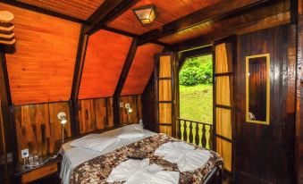 Não se engane pelas fotos. Vou ser bem sincero e direto, a propriedade em si é linda, incrível. Mas o estabelecimento foi esquecido no tempo. Os chalés, estão em péssimo estado, tem frestas para todo lado e não me refiro a pequenas frestas que passa um pouco de ar, tem locais que passa uma mão fechada, na porta do nosso chalé era possível passar um gato pela fresta da porta, as camas velhas, colchões velhos, roupa de cama já amarela do tempo, travesseiros ruins, limpeza deixa a desejar. Instalações elétricas expostas e na base de gambiarra, chuveiros com aquecedores que não funcionam direito, baixo fluxo de água. Casa principal onde fica o restaurante, segue o mesmo padrão, e além de tudo, ainda volta muita fumaça para o salão, a ponto de precisar sair e respirar ar puro do lado de fora. As estradas internas do hotel estão em péssimo estado, pior que estradas de chão de interiores que dependem de poder público... Os funcionários são extremamente simpáticos e atenciosos, são muito prestativos e atendem as solicitações com prontidão. A alimentação é OK, nada demais, mas entrega variedade, tem pequenos deslizes, por exemplo, os pães recheados são todos cortados e ficam ressecados, por mais que sejam relativamente frescos, tem aparência e sabor de velhos por este fator.