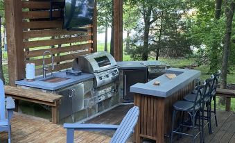 Absolutely beautiful lakehouse with separate guesthouse, outdoor kitchen and bar, screened in porch with swinging bed and gorgeous view, wrap around porches, fire pit, and more. The guesthouse has a queen bed, living area, kitchenette, screen in porch, and beautiful new bathroom. This place is a lake-lover’s dream. The boathouse has space to bring a boat, a lower level sitting area, and an upper level with an expansive, breathtaking view of Lake Bob Sandlin. About pets:No pets allowed.About checkOut:Check out before 11:00 AM.About children:Children allowed: ages 0-17.About checkIn:Check in after 4:00 PM.About smoking:Smoking is not permitted.About minBookingAge:Minimum age to rent: 21.About events:No events allowed.