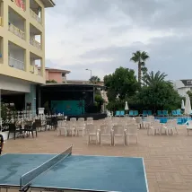 Ich war mit meinem Mann und meinen zwei Töchtern im Teenageralter in zwei Zimmern untergebracht, Nr. 203 mit Blick auf die Straße vor dem Hotel, von wo aus man einen unglaublichen Blick auf die Berge hatte, und einem großen privaten Balkon, und Nr. 312 mit Blick auf den Poolbereich. Beide Zimmer waren geräumig und hatten viel Stauraum, saubere Bäder und die Bettwäsche wurde jeden Tag gewechselt. Auch ein täglich aufgefüllter Kühlschrank und ein kostenloser, leicht zu bedienender digitaler Safe waren tolle Ergänzungen in beiden Zimmern. Das Hotelpersonal war unglaublich hilfsbereit. Der Poolbereich und die Bar waren sauber, es gab viele Sonnenliegen und Tischtennisplatten. Die Strandbar war etwa 20 m vom Strand entfernt. Sie schließt um 18 Uhr, aber wir genossen dort nach einem heißen Tag in der Sonne jeden Nachmittag um 17 Uhr ein Bier im Schatten. Snacks gab es dort auch. Sonnenschirme und Sonnenliegen für unser Hotel am Strand waren eine nette Geste. Meine Tochter spielte fast jeden Tag um 16 Uhr Volleyball. Es gab Wassergymnastik am Pool und andere Aktivitäten wie Darts-Wettbewerbe. Der einzige kleine Minuspunkt, wenn auch nur ein kleiner, war, dass das Essen ziemlich einfach, aber lecker war, und das ist der einzige Grund, warum ich 4 und nicht 5 Sterne gebe. Ich habe jeden Morgen auf jeden Fall ein frisch zubereitetes Omelett genossen. Aber insgesamt hatten wir einen fantastischen, sehr erholsamen Urlaub und möchten dem gesamten Personal dafür danken, dass es so gut war. Wir waren die einzigen Engländer im Hotel, worüber wir froh waren. Die anderen Gäste waren hauptsächlich Osteuropäer und Russen (Mann, rauchen die gerne im Außenbereich!). Es gab auch ein paar Wasserrutschen und ein Planschbecken für Kleinkinder. Ich kann dieses Hotel uneingeschränkt empfehlen.