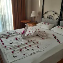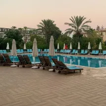 Eine gute „Vier“ mit einem guten Preis-Leistungs-Verhältnis. Economy-Zimmer – keine Aussicht (teilweiser Blick auf die Wand), aber normale Größe, funktionierende Sanitäranlagen und Klimaanlage, Safe – kostenlos. Das Essen war gut, es gab immer Fleisch und Fisch, Obst waren immer Wassermelonen und Melonen, und zum Mittag- und Abendessen gab es auch Orangen, Äpfel, Nektarinen/Pfirsiche, Birnen und ein paar Mal gab es sogar Kirschen. Bedenken Sie bei der Bewertung des Essens, dass es sich um 4 und nicht um 5 Sterne handelt. Erwarten Sie also keine Meeresfrüchte oder frischen Säfte. Zu den Getränken gehören Limonade, Bier, Wein, Brandy, weißer Rum, Whiskey, Gin, Wodka und Cognac. Cocktails sind dementsprechend einfach eine Mischung aus Alkohol mit Pepsi/Fanta/Sprite oder so etwas wie Yuppie. Sehr gutes Hotelpersonal, alle sind sehr freundlich, man zeigt und erklärt gerne alles. Niemand erpresst oder deutet Trinkgelder an, aber man möchte sie geben, weil die Leute es wirklich versuchen 😊 Der Strand ist 5 Minuten zu Fuß entfernt, der Strand ist Kiesstrand, mit Hausschuhen ist es bequemer, aber auch ohne geht es durchaus. Das Wasser ist sauber, es gibt genügend Sonnenliegen und Sonnenschirme. In der Nähe des Strandes gibt es eine Hotelbar, in der Bier, kohlensäurehaltige Getränke und zu bestimmten Zeiten Pizza, Pommes Frites, Äpfel und Pflaumen erhältlich sind. Die Hotelanlage ist klein, aber es ist alles da, was man braucht. Restaurant mit Tischen drinnen und draußen, Schwimmbad, Bar, Bühne. Jeden Tag Abendshows. Übrigens: Wenn Ihr Zimmer auf den Pool blickt, müssen Sie sich bis 23:00 Uhr auf laute Musik einstellen. Die Lage ist in einem kleinen Dorf, aber es gibt viele Apotheken, Geschäfte und Cafés. Zur kleinen Migros sind es 5 Minuten zu Fuss, zur grossen 20-25 Minuten. Schön ist auch, dass das Hotel auf Bewertungen reagiert – viele schrieben über das schwache Internet, aber mittlerweile ist das Internet gut, man kann es sogar im Zimmer empfangen. Reiseveranstalter Sanmar, Gastgeber Odeon Tours, Turkish Airlines. Ausflüge wurden von „Beamten“ übernommen, wir empfehlen sie NICHT, Rafting und Buggys waren im großen Andrang. In Kappadokien haben wir im Bus 4 Stunden auf die Reparatur der Klimaanlage gewartet, Getränke waren nicht inklusive (was bei einem „Straßen“-Unternehmen eher zu erwarten ist), der Guide war eher eine Begleitperson, hat nicht mitgenommen die Gruppe zu den Standorten und erzählte fast nichts.