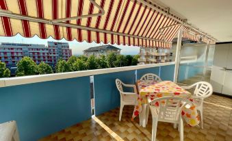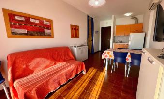 Die Ein-Zimmer-Wohnung befindet sich im 5. Stock eines Gebäudes mit Aufzug und gemeinschaftlichem Außenpool, nur 310 m vom Meer entfernt. Sie verfügt über ein Wohnzimmer mit Doppelschlafcouch, eine offene Küche, einen Esstisch, einen geräumigen Balkon, ein Schlafzimmer mit Doppelbett und Einzelbett sowie ein Badezimmer mit Duschkabine. Ein nicht überdachter Parkplatz ist im Preis inbegriffen. Die Wohnung bietet Platz für bis zu fünf Personen. Klimaanlage ist gegen Aufpreis verfügbar (siehe unten). Die Pools sind saisonal geöffnet (Mitte Juni/Anfang September). Die genauen Daten können je nach Wetterlage oder Wartungsarbeiten variieren.