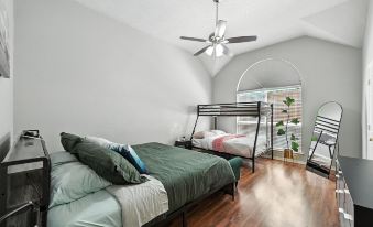 Each bedroom is thoughtfully designed for relaxation, with plush bedding, ample storage, and stylish decor. The master suite is a true retreat, boasting a king-sized bed, an en-suite bathroom with a soaking tub, and direct access to the backyard. The additional bedrooms are perfect for kids or guests, with cozy twin and queen beds, ensuring everyone has their own space to unwind.