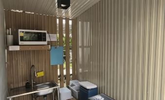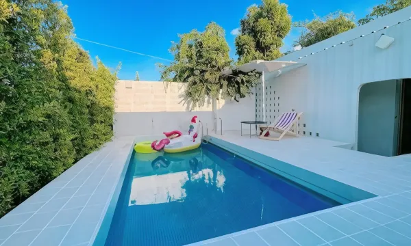 Very relaxing place with small pool, modern build. Inside there are two rooms each similar with small fridge, sofa, toilet, shower/bath and either a large double or two single beds. Outside is a terrace and pool with sufficient privacy.
