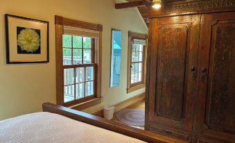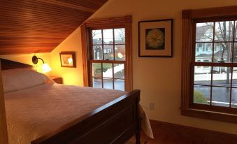 Named for my grandmother, the “Lena Coleman” apartment is a three-room, one bedroom gem. Airy and light, the eat-in kitchen boasts a bay window, with a round oak table and chairs and stained glass chandelier; the inviting living room has built in cabinets and a cozy window seat, two comfortable chairs and a smart-TV. Wi-Fi is available throughout the house. Perfect for a couple, the bedroom has a comfortable queen bed and a natural bead-board ceiling with exposed beams. The bath is beautifully tiled with a marble sink and sky light. Enjoy your morning coffee on the private roof deck with your loved one or watch the sunset while sipping a glass of wine. The charm of the apartment is further enhanced by the warm glow of beautifully refinished, hand-laid, wide pine, antique floors.