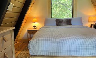 *NOTE* This cabin is perfectly designed to be small and cozy, but also have everything you need to both live and work comfortably. A majority of our guests are single couples or families with children. This cabin can easily accommodate two couples, but it will be on the cozy side. Ladder-like stairs lead to the loft bedroom with queen size bed. Also, please note that access to the bathroom is through the downstairs bedroom, this is good to keep in mind for any nighttime restroom needs. If you are elderly or have any mobility issues these notes might be good to consider. Some outdoor road noise due to proximity to Hwy 97. I live on the adjacent lot in the cedar home and am usually available to provide any assistance during your stay.