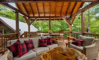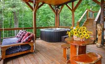 Outside, the enchantment continues as you explore the meticulously manicured grounds. The entry-level deck invites you to relax on rockers, soak in the hot tub, or sway gently on the bed swing while taking in the stunning mountain scenery. A stone-laid grilling station with seating and a cooler makes outdoor cooking a delight, while the year-round waterfall feature and the stone-laid fire pit with Adirondack chairs provide the perfect settings for memorable evenings under the stars. Wander along the picturesque walking paths, discover charming carved bear statuettes, and find peaceful moments on the scattered bench seating or the inviting swing.