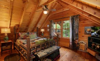 Ascend to the upper level, where the luxurious queen bedroom invites you to sink into its plush bed and enjoy the comfort of a 55” TV. A charming sitting area with a bench and a cozy chair provides an ideal nook for reading or simply enjoying the tranquility of the cabin.