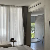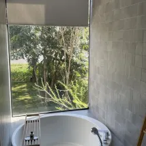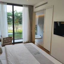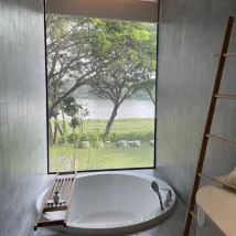 Das Bett ist bequem. Das Badezimmer verfügt über eine Badewanne mit Blick auf den Fluss Kok im Freien.