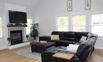 Our home provides enough beds for 8 guests to sleep comfortably. There is also a twin-sized futon provided, a foldable children's crib, and an ample amount of couch space. We recommend staying between 8-10 guests, but space allows for up to 12 adults. There are two full bathrooms, both providing showers that accommodate the taller than average guest. Our master bathroom has a shower/tub combo, our upstairs bathroom has a walk-in shower. As well as open yard space, we also provide a firepit and grill for your FULL summer experience. There is also no need to worry about parking. The house provides driveway space that can fit at least 8 vehicles, or even more if you are any good at Tetris! You will find an abundance of entertainment provided throughout our home including games, puzzles, FREE cable and WiFi, and smart TV's in each room. On top of that there is a spacious screened in 3 seasons room, and an outdoor dining set on our large back deck.