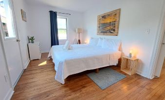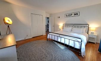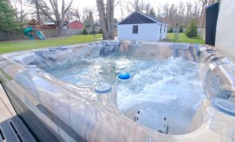 The highlight of this retreat is the expansive grassy lawn featuring an above-ground heated pool with a built-in deck. Watch your kids create lasting memories in the playground, bask in the sun by the pool, or savor delicious barbecues with the gas grill provided. In the evenings, unwind in the private hot tub, creating the perfect ambiance for relaxation and connection. For those seeking extra privacy, the pool house offers a queen bedroom and a full bathroom. The stylish furniture inside is perfect for lounging after a refreshing swim, and amenities like a refrigerator, coffee pot, and toaster add a touch of convenience to enhance your stay. Please note the pool house has limited hot water, no heat or AC but a large ceiling fan that keeps it cool during the warmer months.