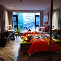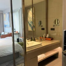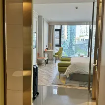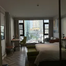 Das Zimmer verfügt über große, vom Boden bis zur Decke reichende Fenster und der Designstil ist schlicht und modern. Das Zimmer ist sehr sauber. Die Ausstattung ist komplett und intelligent. Es gibt auch einen Roboter, der Dinge liefern kann. Rund um das Hotel gibt es viele Hotpots und Grills. Mit den großen raumhohen Fenstern im Hotelzimmer bin ich sehr zufrieden und auch der Designstil ist schlicht und modern. Das Zimmer ist sehr sauber. Die Ausstattung ist komplett und intelligent. Es gibt auch einen Roboter, der Dinge liefern kann. Es gibt viele Hot Pots und Grills rund um das Hotel. Es ist sehr bequem, herumzureisen. Ich bin sehr zufrieden mit dem Hotel.