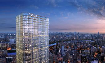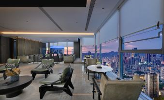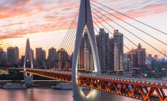 At night, the hotel's high-altitude viewing area presents a stunning panorama of Chongqing's skyline and the glistening Jialing River.