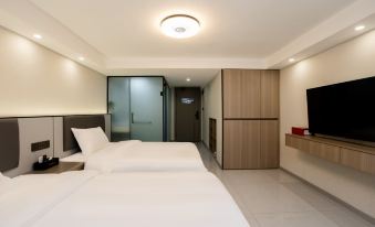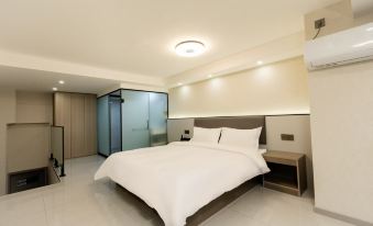 房間衞生打掃的很好,而且沒有異味,房間設備都很新。外面交通便利,樓下就有餐館。