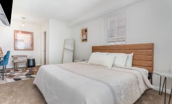 1 Bedroom—King size bed, smart TV, desk, small city view from window, closet, and sitting area